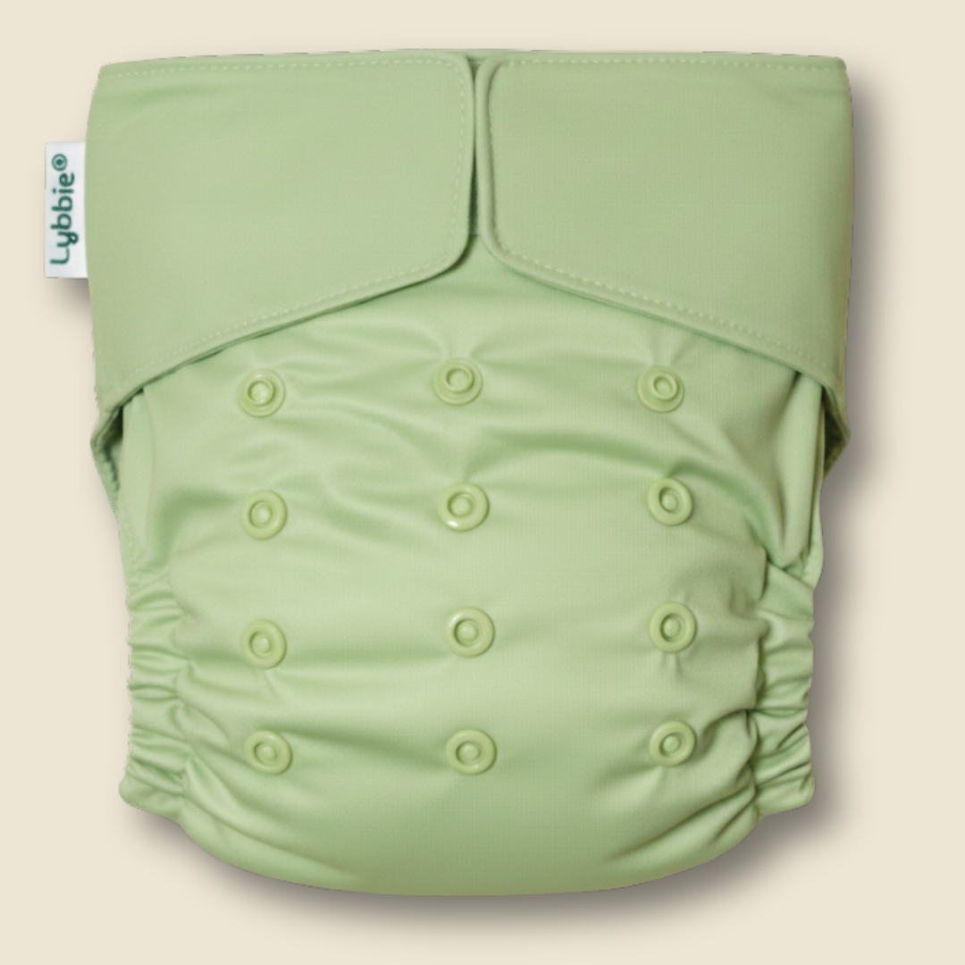 Lybbie ist eine All-in-One-Windel. Alles ist in einem Teil integriert, ganz ohne zusätzliche Einsätze.